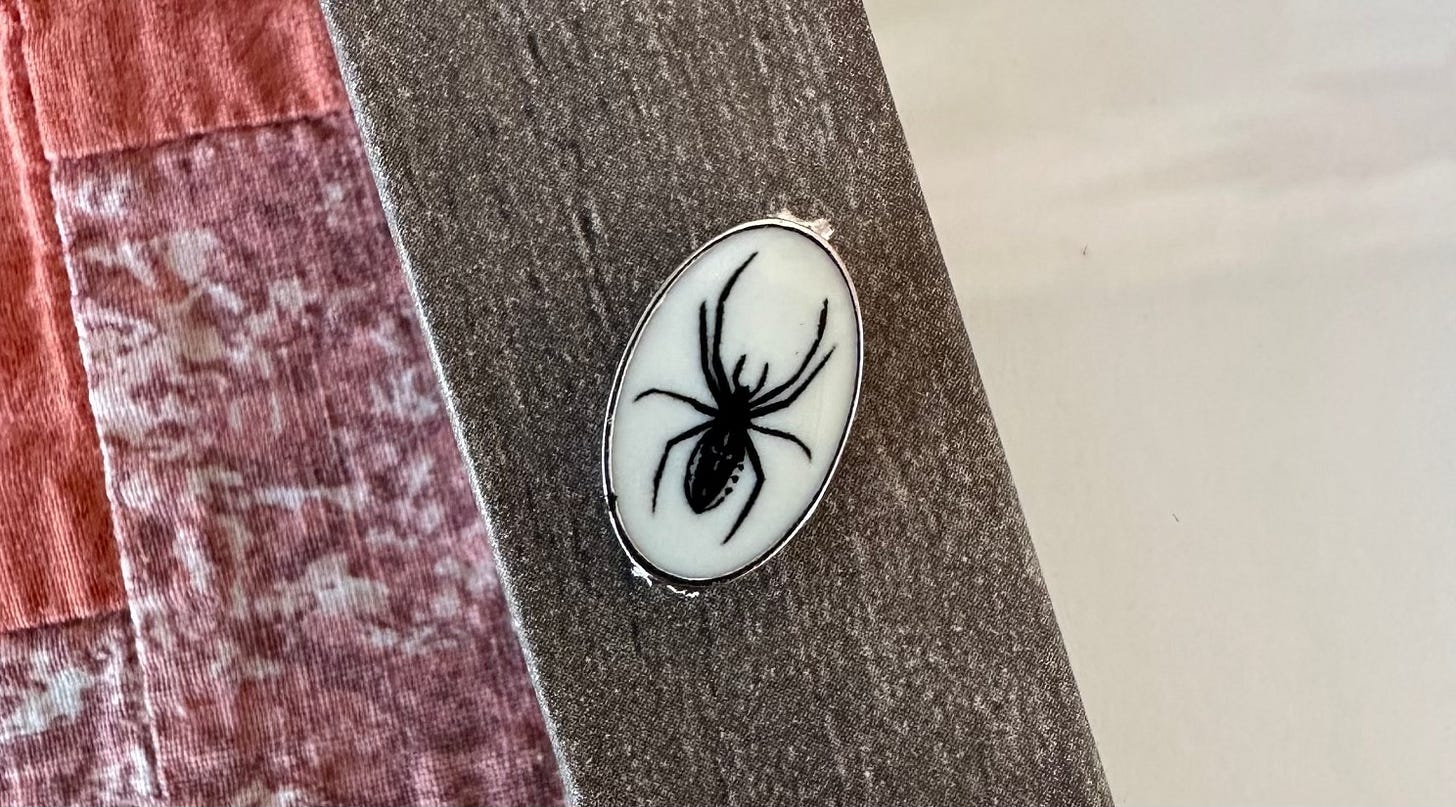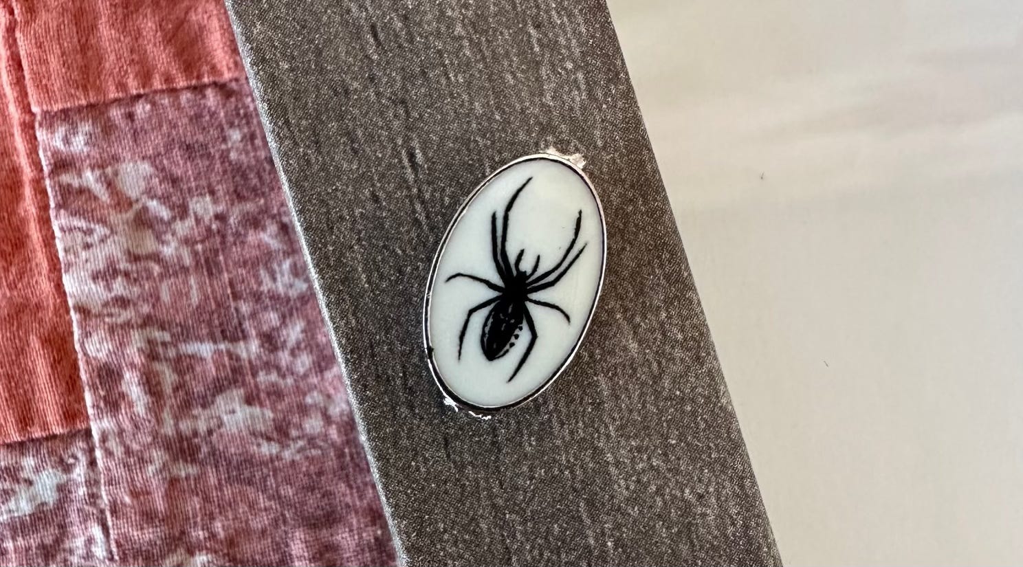 I find my way to the jewelry supply aisle and squint at the bits and bobs: an array of good luck charms; an assortment of gold and silver initial letters; some glass evil eye beads. Next row: dogs, crystal hearts, bees. Next row: Stars and moons and suns and … AH! Six oval charms, black on white – three spider webs and three spiders about as big as a fingernail. I’m so happy I nearly skip to the cashier.